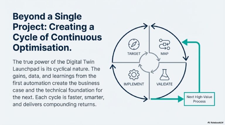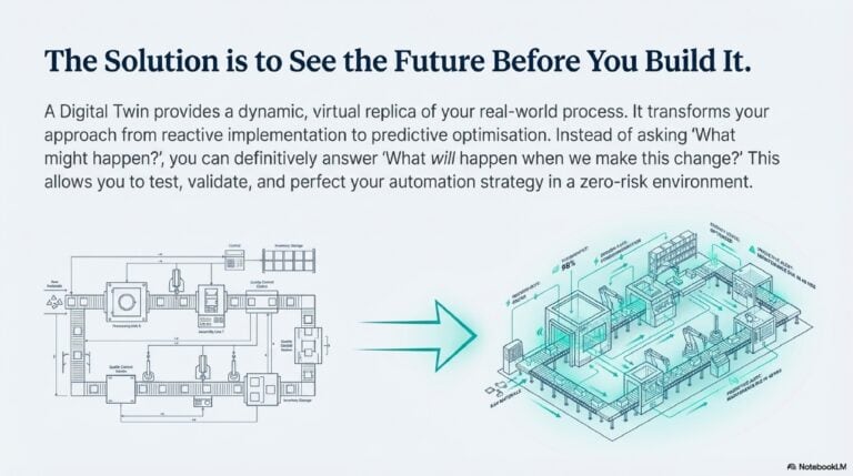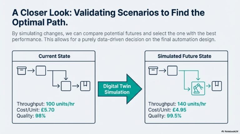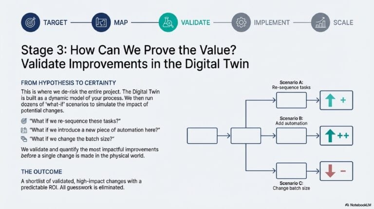 - Build the Digital Twin to run what-if scenarios, validating the most impactful improvements before automation.