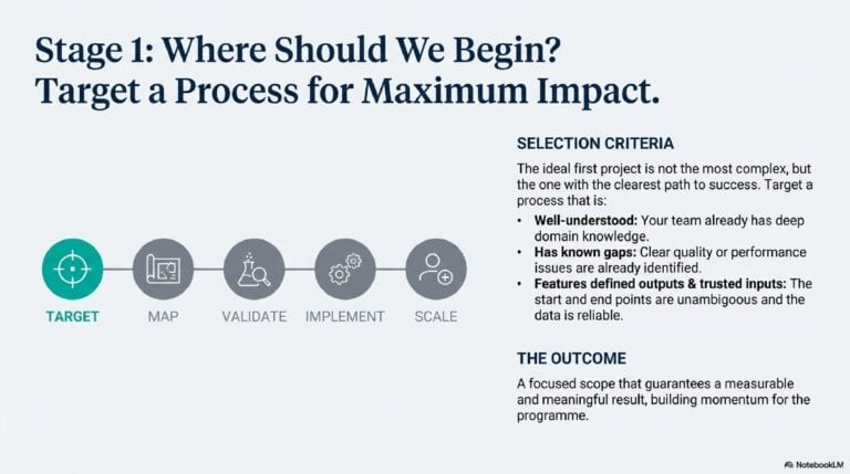 - Target a well-understood process with known quality or performance gaps, clearly defined outputs, and trusted inputs.